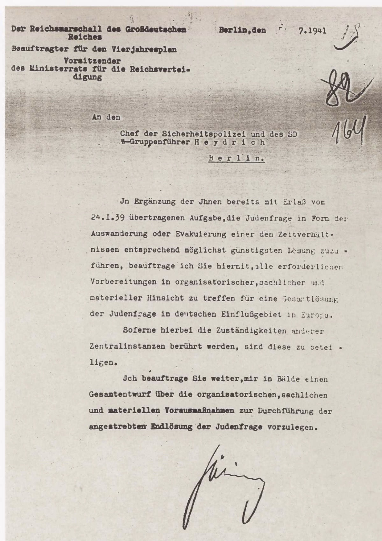 Die praktische Umsetzung der angestrebten Endlösung wurde ab Herbst 1941 intensiv vorbereitet. Am 31. Juli 1941 erteilte Göring Reinhard Heydrich schriftlich den Auftrag, nun alle nötigen Vorbereitungen zu treffen. In Görings Schreiben wurde gefordert, Heydrich solle „mir in Bälde einen Gesamtentwurf über die organisatorischen, sachlichen und materiellen Vorausmaßnahmen zur Durchführung der angestrebten Endlösung der Judenfrage vorzulegen“.
